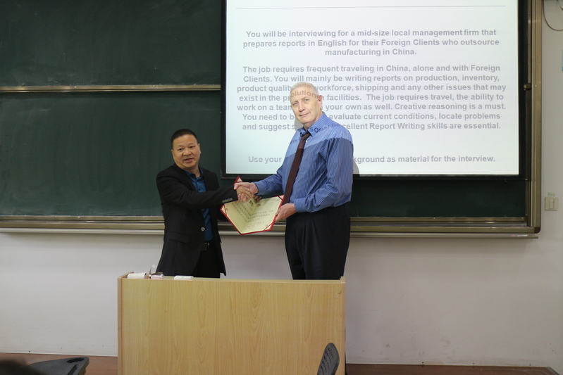 Kenneth Joe Galloway本学期在我校开设了三门公开课,分别为商务和社交礼仪、简历制作、访谈技巧,该系列公开课面向全校学生开放,采用全英文小班制教学,课程讲理论、重实践,有效的帮助学生提高了各项技能,受到了学生的一致好评。