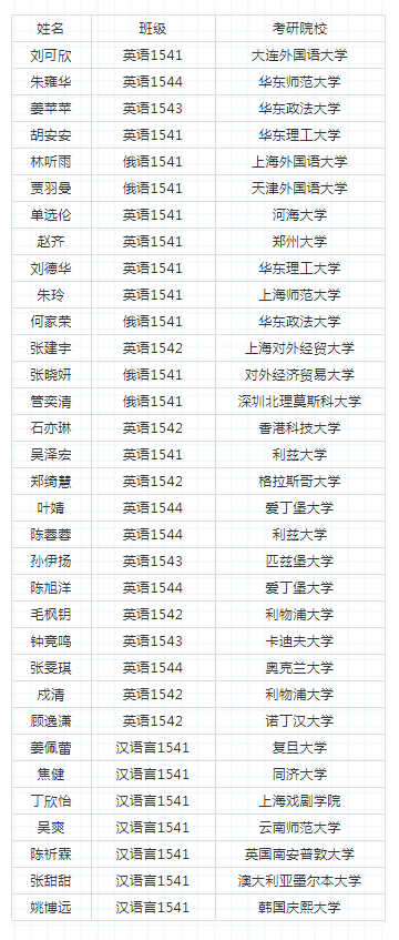 2019届毕业生中,全院共33名学子成功考取了国内外高校的研究生,其中不乏复旦大学、同济大学、华东师范大学、香港科技大学、诺丁汉大学和爱丁堡大学等多所国内外知名高校,实现了考研成绩的重大突破。衷心祝愿所有同学前程似锦、未来可期,风雨兼程创佳绩,乘风破浪再远航。