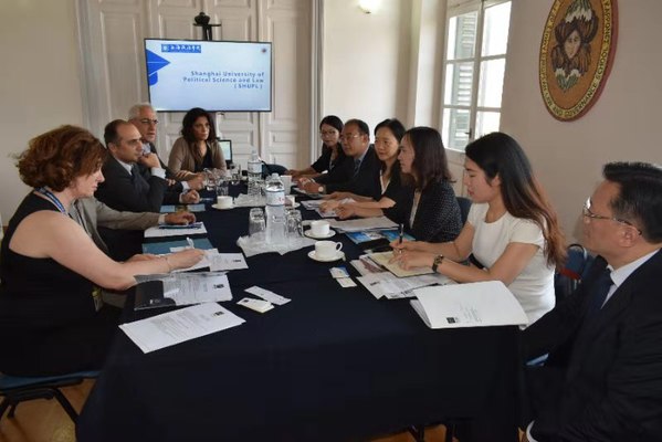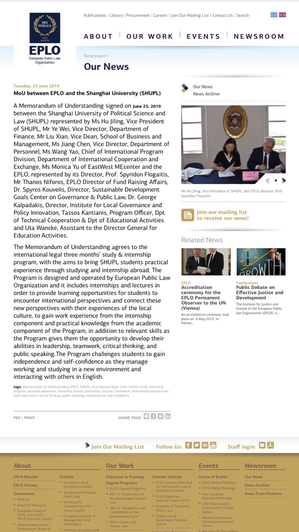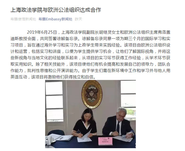 6月25日,代表团应邀访问了欧洲公法组织并举行我校学生赴该组织进行3个月的国际学习实习项目签约仪式。该项目为落实上海市教育委员会资助上海市高校学生赴国际组织实习的号召,依据《上海市教育委员会资助上海市高校学生赴国际组织实习项目管理办法(试行)》和《365英国上市公司落实市教委资助上海市高校学生赴国际组织实习项目管理办法(试行)》的规定,由欧洲公法组织负责设计,以便为我校学生提供学习和实习机会,从项目的实习环节获得工作经验,从学术环节获取实用知识。经过前期良好沟通,该项目于2019年5月在我校发布。欧洲公法组织非常重视此次活动,欧洲公法组织主席Spyridon Flogaitis教授、主任Vassiliki Lykoura女士、政府管理与政策改革研究院主任George Kalpadakis教授、资金筹措部主任Thanos Niforos、欧洲法和政府管理学院教育活动主任助理Uta Wancke参加会谈与签约仪式,并邀请了合作伙伴加入会谈,包括希腊前外交官、现任政府与公法可持续发展中心主任Spayros Kouvelis博士、企业发展专家Christina Deligianni等专家和管理人员,就加强我校与欧洲公法组织的合作交流和教育等领域的合作交换意见。胡继灵详细介绍了我校相关情况,表示中希同为文明古国,都有重视教育和研究的古老传统,我校与欧洲公法组织的学生3个月实践项目只是开端,未来将进一步加强全方位的合作。Spyridon Flogaitis非常赞赏我校落实该项目的执行力,双方签署了合作备忘录,以此为契机,建立更加紧密的合作关系,为提升双方教育国际影响力、竞争力作为贡献。