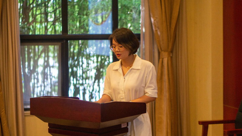 安徽财经大学孟露同学作为优秀学员代表发言。她代表所有学员对承办方、各位专家和老师表示感谢,向所有老师和学员汇报了暑期学校的学习成果。短短12天时间、在18场讲座中,专家以翔实的案例和深厚的理论给大家带来了一场思想的盛宴,开拓了思维。