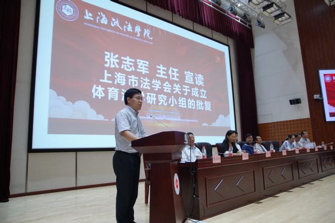 张志军受上海市法学会副会长施伟东委托宣读上海市法学会体育法学研究小组成立的批复。