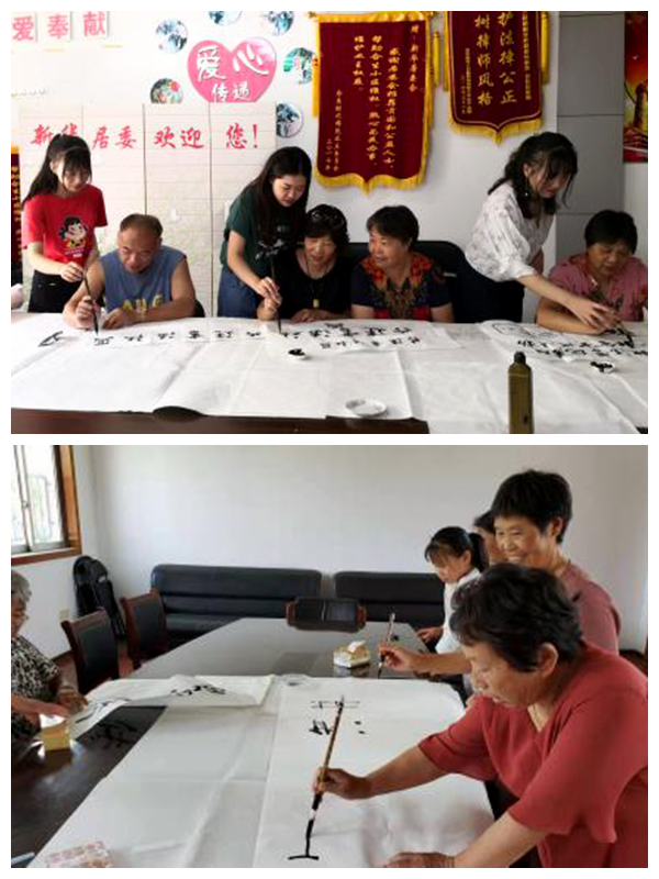 8月21日,实践团队走进江苏镇江丹徒区古洞镇党群活动中心展示和宣传我国传统书法艺术,向社区居民传达高品质的美,宣扬优雅的休闲方式,提供宁静的养生方法,陶冶居民的生活情操。