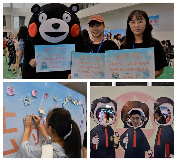 法律学院迎新现场主要分为本科生报到区、研究生报到区以及法律易班三个区域,在为新生报到带来便利的同时也体现了法律学院此次迎新“法律共同体”的主题。