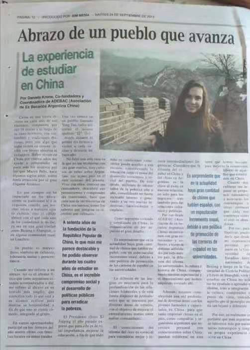 我校国际政治专业本科生、阿根廷前赴华留学生协会会长KRONE DANIELA AYELEN也应邀发表了署名文章。她在文章中提到,中阿建交47年以来,两国关系日益密切,合作交往日益频繁,两国人民的友谊也更加深厚。语言的相互传播是加深双边关系的必要条件,正因为这样,她来到中国留学。在文中,她还分享在中国、在上政的学习和生活感悟。