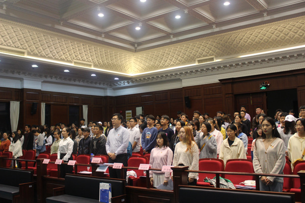 全体师生起立,奏唱团歌。在庄严神圣的歌声中,法律学院第八届“我讲你想”学生骨干训练营正式拉开帷幕。