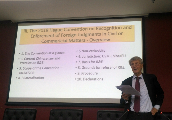 此Hans Van Loon为我校师生详细比较介绍了2005年《选择法院协议公约》和2019年《承认与执行外国民商事判决公约》,他从制定上述两项公约的历史开始进行介绍首先讲解了以上两个公约的制定目的,强调二者均具有促进国际民商事纠纷公正、高效解决的目的,并且由当事人合意选择的法庭作出裁判,能够减少和消除当事人对法庭承认和执行外国民商事判决的争议。Hans Van Loon分别讲解了《选择法院协议公约》的适用范围、三项主要原则以及该公约旨在解决的问题,《承认与执行外国民商事判决公约》的适用范围、判决承认和执行的理由、拒绝承认和执行判决的理由以及公约的非排他性。