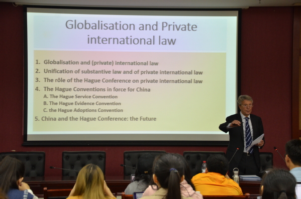 在首场讲座《全球化与国际私法》中,Hans Van Loon从五个方面介绍了全球化视阈下的国际私法:全球化对国际私法的影响;实体规范和国际私法的统一;海牙国际私法会议在全球化中的作用;在中国适用的海牙国际私法会议条约;中国与海牙国际私法会议的未来。Hans Van Loon阐述了中国在过去几十年对海牙国际私法会议工作的贡献,以及海牙国际私法会议制定的条约对中国的影响。最后,就“中国接下来还可能加入哪些条约”以及“未来中国可以对海牙国际私法会议做出哪些贡献”与同学们进行了热烈的讨论。