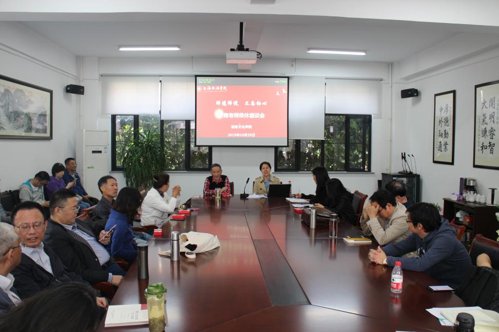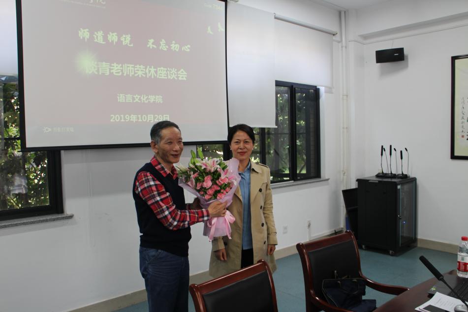 10月29日下午,语言文化学院在A1-101会议室召开谈青老师荣休座谈会,学院全体教职工参加,党总支书记姚善英主持。
