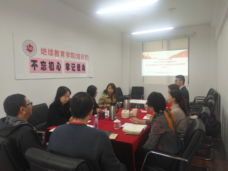 11月12日上午,继续教育学院(培训部)党支部在普陀校区会议室召开了“不忘初心、牢记使命”主题教育学习会,学习党的十九届四中全会精神、习近平总书记考察上海重要讲话精神和在第二届中国国际进口博览会开幕式上的主旨演讲精神。支部全体党员参加了学习会,并就学习体会展开交流讨论。