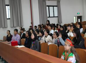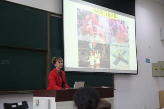 妮娜多年前在中国取得了汉语国际教育硕士学位,主要研究方向为跨文化交际学及跨文化心理学等。这些年,妮娜一直在中国的高校教授中国学生俄语。她结合自身研究及中国学生学习俄语的特点,从人名地名等专有词汇、文化不对等词汇及外语学习心理及学习品质等三个方面详细讲解了俄语语言文化的特点,点明了通向掌握俄语的三把钥匙。随同妮娜一起来的还有她十岁的的小女儿阿丽娅。阿丽娅身着俄罗斯民族服装,用中俄两种语言给现场的师生们献唱了一首经典俄罗斯歌曲《莫斯科郊外的晚上》,小姑娘稚嫩的嗓音和入情的表演赢得了师生们的阵阵掌声。