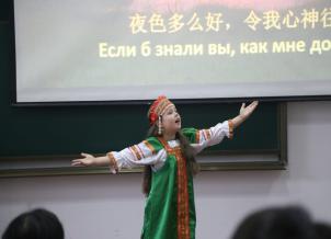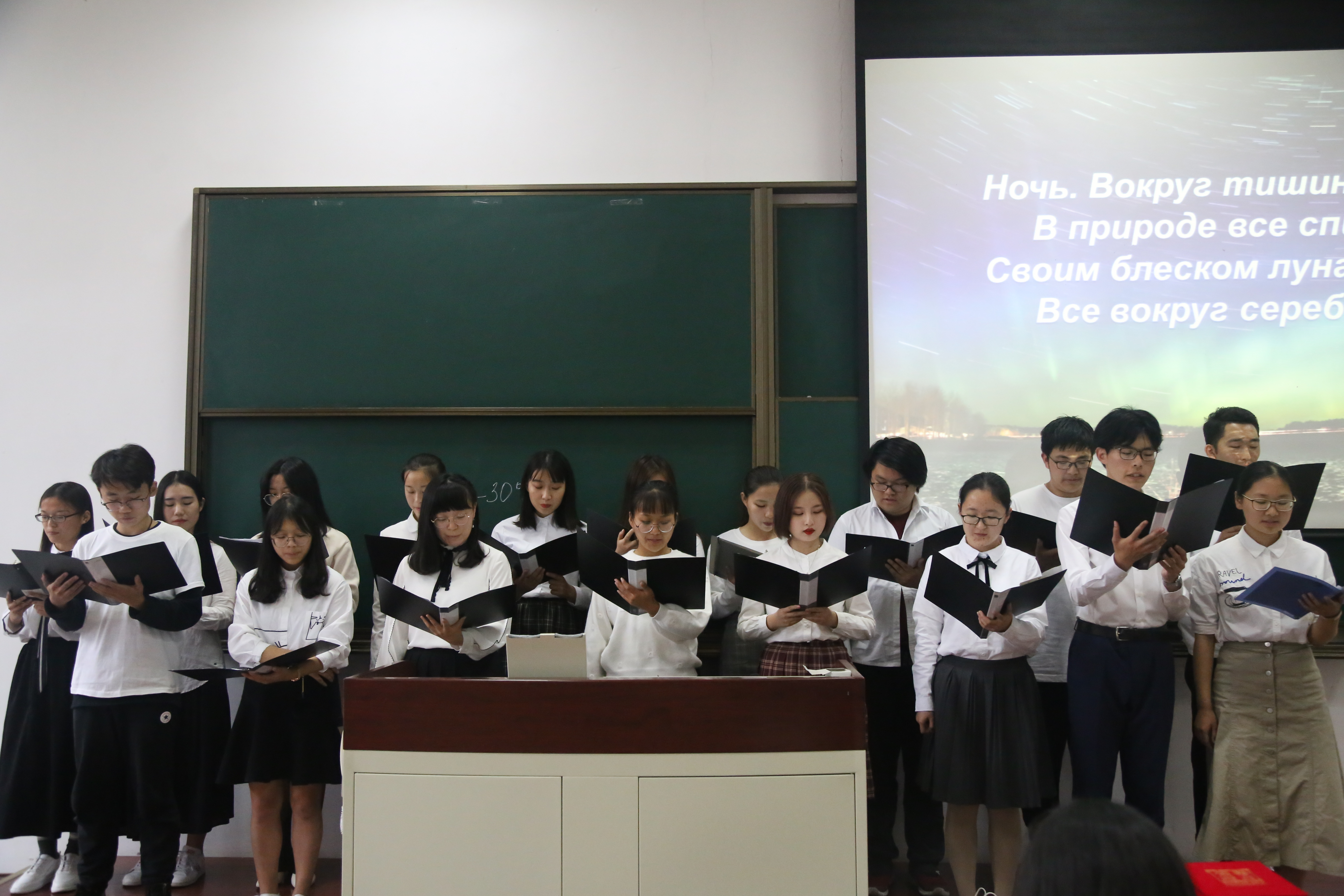在接下来的互动环节,俄语专业的学子们也各自带来了精心准备的节目。二年级成为下半场的主力,不仅表演了优雅的民族舞蹈,王晓倩演唱了俄罗斯流行歌曲,我校“松林合唱团”也集体亮相,一展歌喉,第二次在全场唱响了那首悠扬的经典歌曲《莫斯科郊外的晚上》。一年级的学弟学妹们也不示弱,用那尚有些生疏的俄语表达着对俄罗斯文化的理解。一班的同学激情朗诵被誉为“俄罗斯诗歌的太阳”的诗人普希金的名诗“假如生活欺骗了你”,二班小伙伴则深情诵读了被誉为俄罗斯田园派诗人叶赛宁的“夜”。三年级学长们大部分在俄罗斯留学,剩下的几位代表自己的集体,吟诵了叶赛宁另一首诗“星星”。现场观众陶醉其中,气氛热烈。