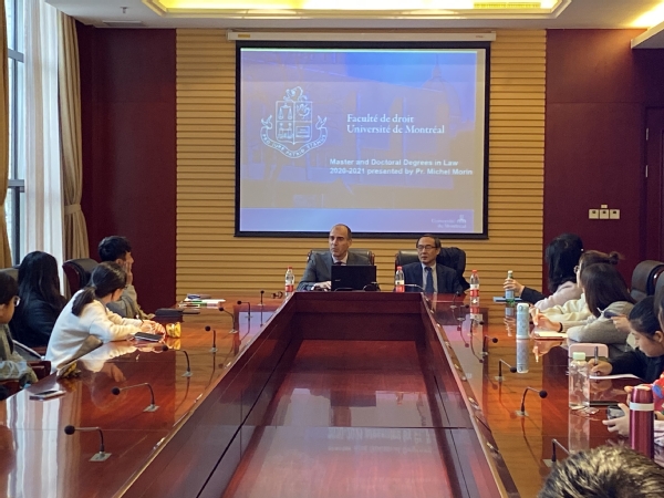 Michel Morin在综合研究中心101室举办了项目宣讲会活动,他为到场的学生详细地介绍了蒙特利尔大学的地理位置、校园文化、学术发展等基本情况,着重介绍了与我校开展的合作项目情况。焦杰就学生较为关注的LLM学位项目入学条件、专业方向、申请流程进行了补充说明,并耐心回答了学生们提出的问题。