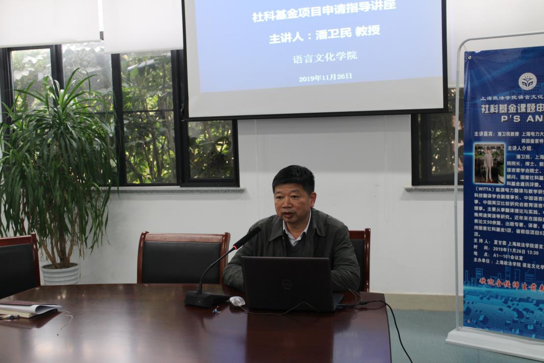 为支持教师申报国家社科基金项目,近日,语言文化学院举办了语言文化讲坛第五讲,邀请上海电力大学外国语学院院长、英国皇家特许语言家学会院士潘卫民教授为全体教师做了一场题为“社科基金课题申报:Q’s and P’s”的讲座。