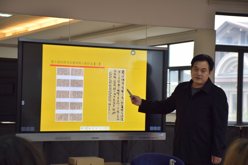 近日,上海市书法家协会会员、上海市青年书法家协会副秘书长、江苏省国画院特聘书法家、松江区书法家协会理事方存双先生应邀来我校,在工会307会议室作“展览视野下的中国当代书法”书法讲座。讲座由学校书画社指导老师刘亮主持,书画社的同学们及校内部分对书法感兴趣的师生参加并认真聆听了讲座。