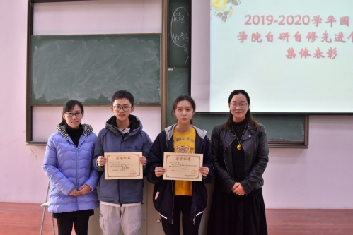 本次表彰活动分为两部分。第一部分由主持人介绍学院实施“自研自修”制度的初衷和意义,以及本学期开展的情况。第二部分分别由陈娜和周洁为在“自研自修”制度开展中表现优秀的集体以及个人颁发荣誉证书。
