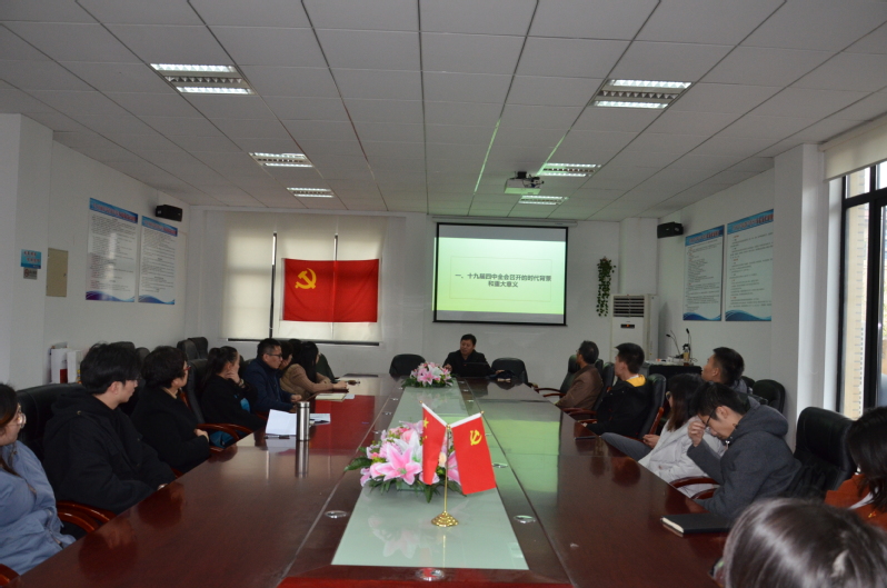 为深入学习贯彻党的十九届四中全会精神,深化“不忘初心、牢记使命”主题教育,根据学校党委统一部署,12月24日,经济法学院在B1-201会议室召开党的十九届四中全会精神宣讲会。市教卫党委讲师团、学校宣讲团成员、马克思主义学院党总支书记徐俊峰教授受邀作专题宣讲。学院教工党员、群众以及学生党员代表参加。宣讲会由学院党总支书记郭斌主持。