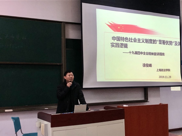 徐俊峰紧扣习近平总书记在十九届四中全会上的重要讲话和全会《决定》,从充分认识坚持和完善中国特色社会主义制度、推进国家治理体系和治理能力现代化的重大意义;深刻领会中国特色社会主义制度和国家治理体系的显著优势,坚定中国特色社会主义制度自信;准确把握坚持和完善中国特色社会主义制度、推进国家治理体系和治理能力现代化的总体要求、总体目标和重点任务;加强党的领导,确保全会确定的各项目标任务全面落实到位等四个方面对全会精神进行了系统阐述和深入解读,对学习宣传贯彻全会精神谈了认识体会。