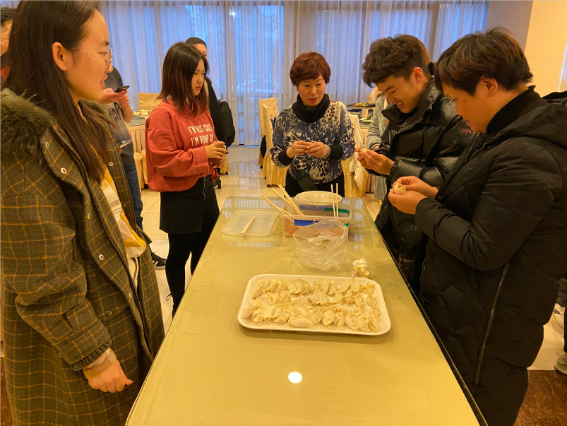 联谊会上,大家摩拳擦掌,兴致高昂,在老师的带领下,纷纷动手包起了饺子,通过相互合作、互相指点,一个个形状各异、玲珑剔透的饺子诞生了。随后在食堂阿姨的帮助下,包好的饺子下了锅,不久热腾腾的饺子上了桌。大家品尝着自己的劳动成果,不由自主的流露出发自内心的喜悦,同时也切身感受到食堂师傅日常工作的辛劳。