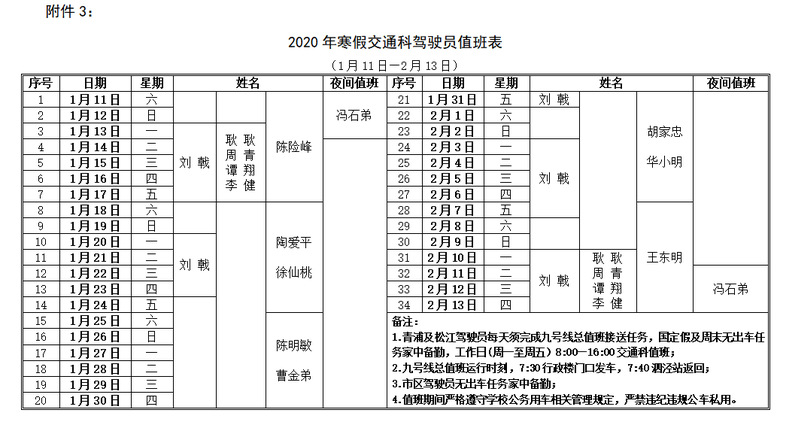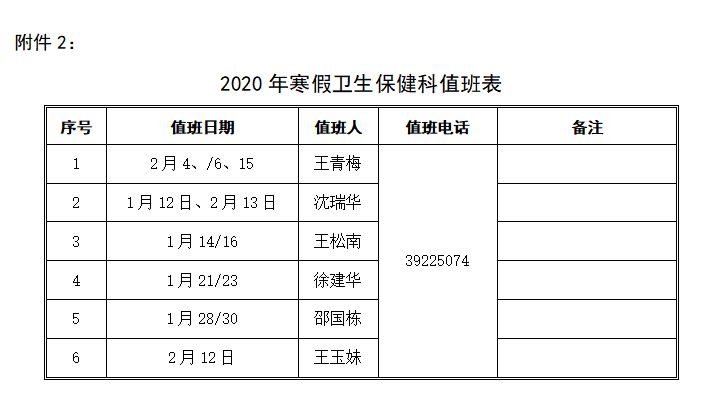 一、校后勤保障处2020年1月13日(周一)—2月13日(周四)安排专人值班,协调学校后勤保障工作(值班人员见附件1)。