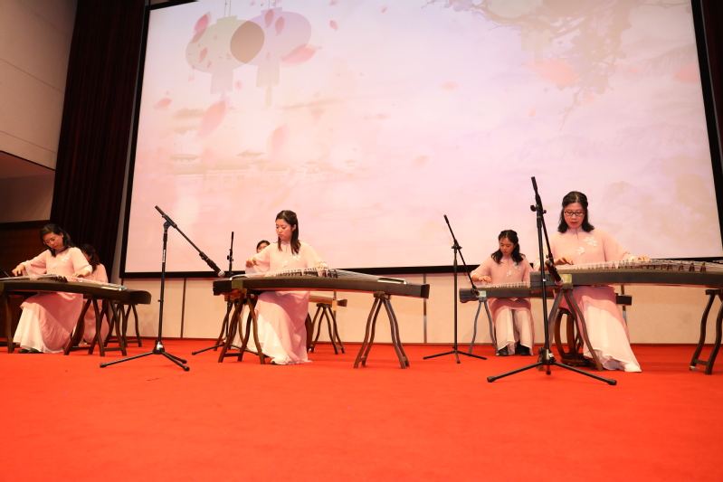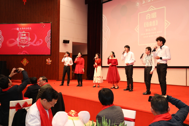 2019年学校工作回顾视频拉开了团拜会表演序幕。学校工会、学工队伍、教职工代表、后勤工作人员、学生合唱团以及可爱的“政二代”小朋友们分别带来了歌曲、舞蹈、诗朗诵、古筝演奏等节目。团拜会现场气氛热烈、掌声不断。
