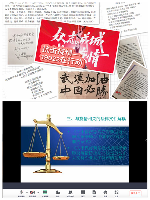 法律19022团支部以线上会议的形式开展了此次学习,支部5位团员分享了“新冠疫苗临床研究志愿者”“复旦大学外国语学院学生组织有关抗疫翻译志愿者服务队”“18岁大学生徐卓立”等与抗疫有关的新时代新青年的人物故事。此外,还特别邀请河北万千律师事务所主任、省级优秀律师王学朋为全体团员作“如何看待疫情下的法律现象”讲座。
