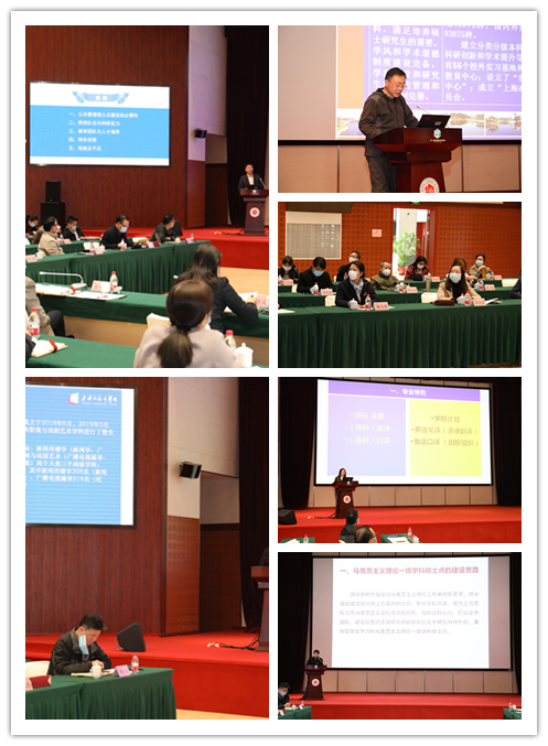 政府管理学院院长汪伟民、党总支书记连淑芳分别汇报了公共管理硕士点、国家安全学科硕士点(筹)的申报准备情况及社会工作专业硕士点的建设情况。经济管理学院院长刘志强汇报了理论经济学和审计学两个学位点的申报准备情况及国际商务专业硕士点的招生培养情况。语言文化学院副院长华莉汇报了中国语言文学和翻译学两个学位点的申报准备情况。上海纪录片学院理事会理事长、学科带头人戴元光教授,马克思主义学院副院长徐世甫分别汇报了新闻学、新闻与传播和马克思主义理论三个学位点招生以来的人才培养情况和今后的建设思路。