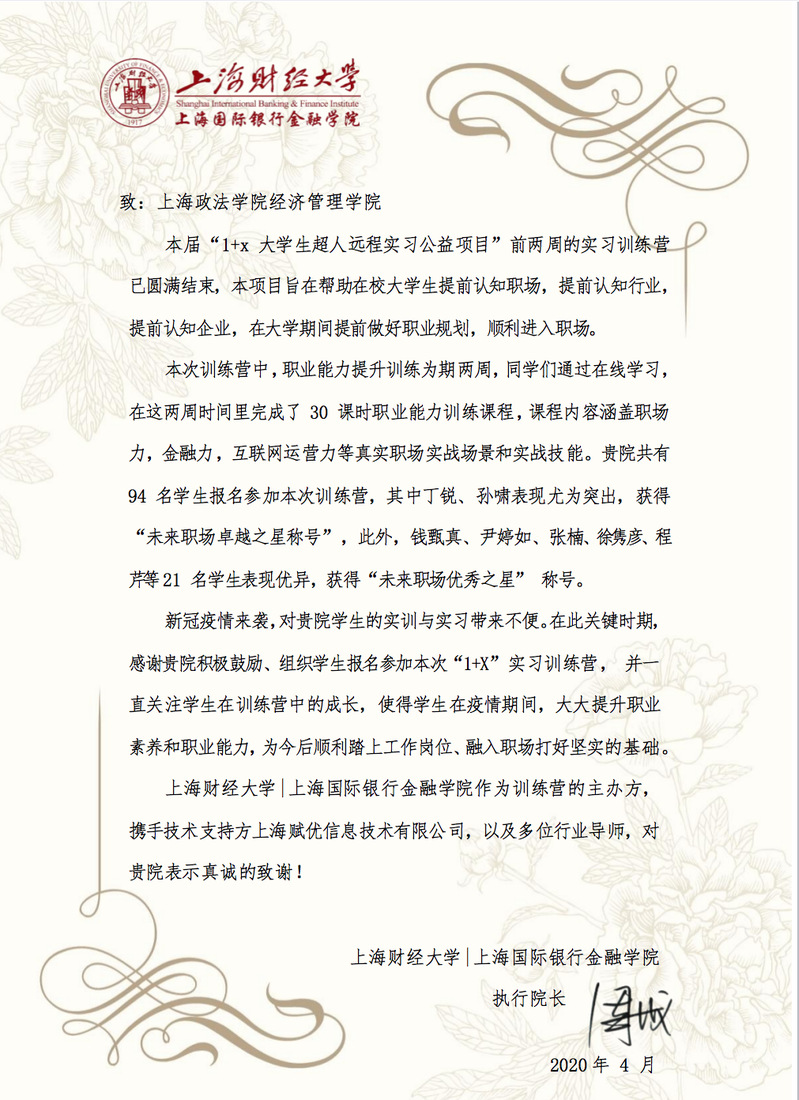 学院与上海财经大学上海国际银行金融学院、中华会计网校、全国商贸职业教育集团等单位开展合作,推出了“1+X大学生远程实习”、助理会计师考试辅导课程、区块链普及教育课程等一系列免费的线上实习和学习项目。毕业生积极参与,认真实习,受到了举办单位的肯定,并收到了感谢信。一系列的线上实习和学习项目,让毕业生在疫情期间大大提升了职业素养和职业能力,为今后顺利走上工作岗位、融入职场打下坚实的基础。
