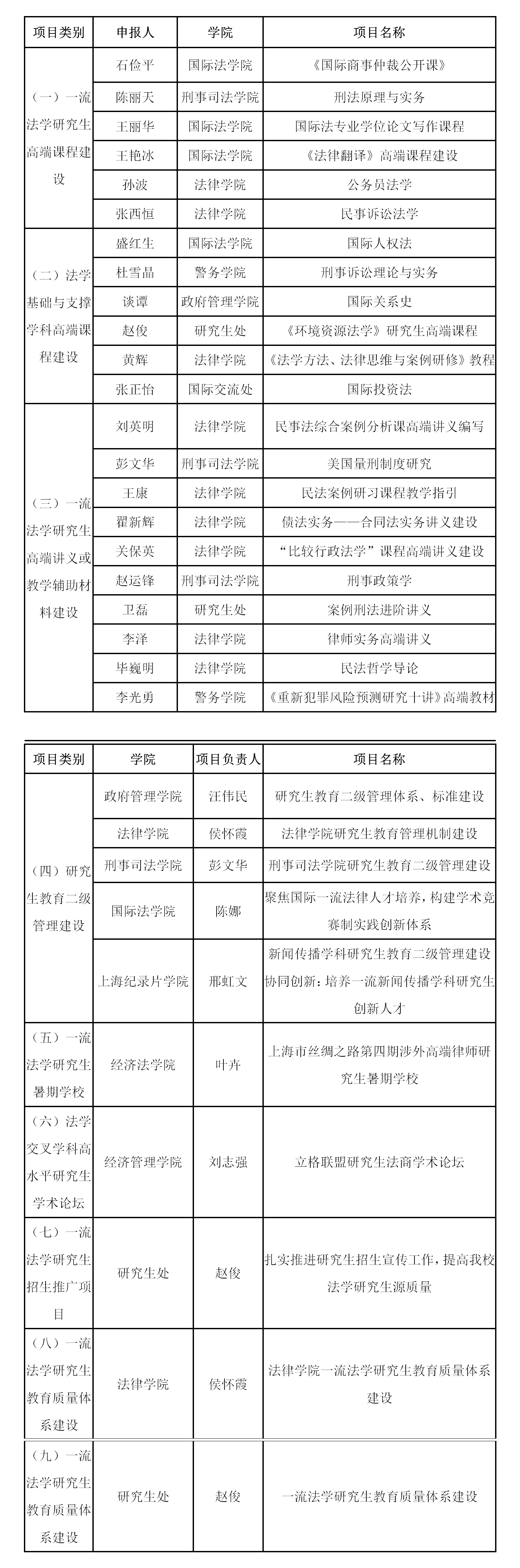 根据学校2020年度“一流研究生教育引领计划”实施总体安排,研究生处组织开展了2020年度“一流研究生教育引领计划”项目申报,经各有关学院、部门与相关教师申报、推荐,专家评审,建议对下列项目予以拟立项,现予公示。公示时间为2020年4月22日至4月27日,对立项结果若有异议,请在公示期内向学校一流研究生教育建设工作小组(研究生处)反映。联系人:邓雯萍,联系电话:021-39227143。