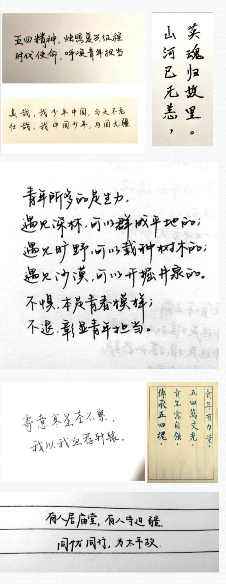 “星火终相聚,燃魂照远方”活动主要分为线上手书和有奖竞答两个环节。线上手书沙龙环节中,同学们阅读、挑选了自己喜欢的有关歌颂祖国、弘扬五四精神的好句、好诗,自己手写的软笔或者硬笔作品拍照上传,形成线上鉴赏沙龙。线上有奖答题赛环节中,同学们对五四青年节的历史背景、文化精神、英雄事迹有了更深刻的认识。