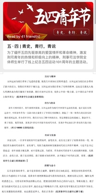 为纪念“五四”爱国运动101周年,激励和引导刑司青年大力弘扬“爱国、进步、民主、科学”的“五四”精神,培养刑司青年爱国、爱党、爱团的坚定信念,激发刑司青年历史责任感和时代使命感,刑事司法学院举办了纪念“五四”运动101周年线上主题活动。