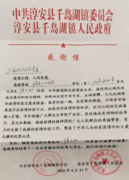 近日,我校收到一封来自浙江省淳安县千岛湖镇人民政府的感谢信,感谢语言文化学院2019级汉语国际教育专业徐天如同学主动请缨,助力社区一线防控工作。