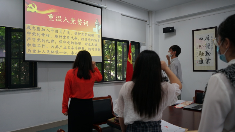 周欣为全体毕业生党员颁发党员初心卡,李洋带领全体党员重温了入党誓词。