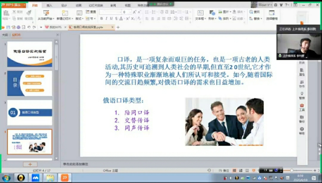 讲座过程中,李利群结合自己多年一线俄语口译实战经验,针对翻译过程中的常见问题,从翻译的基本礼仪、口译类型、口译理解到跨文化词汇的处理策略,从翻译修辞、谈判技巧,到口译记忆及同传笔记记录方法等多方面进行了详细又生动的讲解。同时,他还分享了口译过程中,有准备、无准备,带稿同传和无稿同传的自身实战体会及不同情况下口译实践的译前准备技巧及建议,讲到了翻译过程中沟通的重要性及译前准备时需注意的重要“小”细节等。