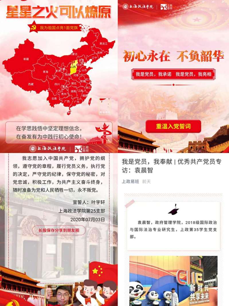线上点亮党旗,我是党员我带头。7月1日,我校学子通过“上政易班”微信公众号小程序开启线上点亮党旗活动,来自全国不同地区的同学点击中国地图上所在省份的党旗,就可以在祖国不同的角落点亮党旗,犹如99年前的星星之火,可以燎原。来自上海纪录片学院的学生党员赵振宇表示,在疫情防控最严峻的时候成为一名志愿者,参与到社区防疫的第一线,深刻感受到了在危难时刻基层党支部所发挥的战斗堡垒作用。“云”方式点亮了家乡的党旗,让自己感到无比自豪。