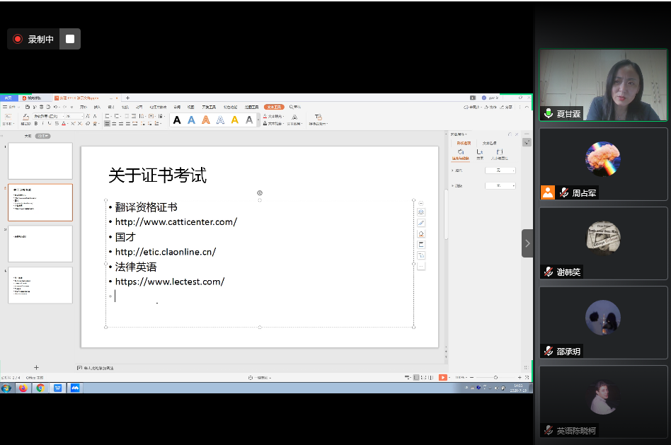 为增强英语专业学生对翻译职业资格考试的了解,7月15日下午,语言文化学院召开了2019级英语专业翻译学习动员会,夏甘霖副院长担任此次动员会的主讲人。2019级英语专业全体学生及俄语、汉语和汉语国际教育专业部分学生线上参加会议。