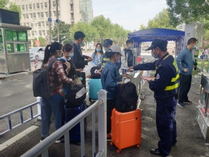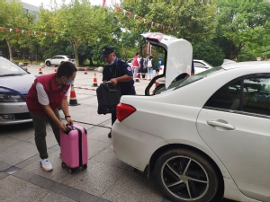 今年因防疫要求,保卫处提前在庸夫广场设置四个新生报到车辆引导缓冲区,引导开车送新生报到的家庭前往缓冲区报到,卸载行李。对于行李较多的新生,保卫处也安排校卫队员以及平安志愿者帮忙搬运。