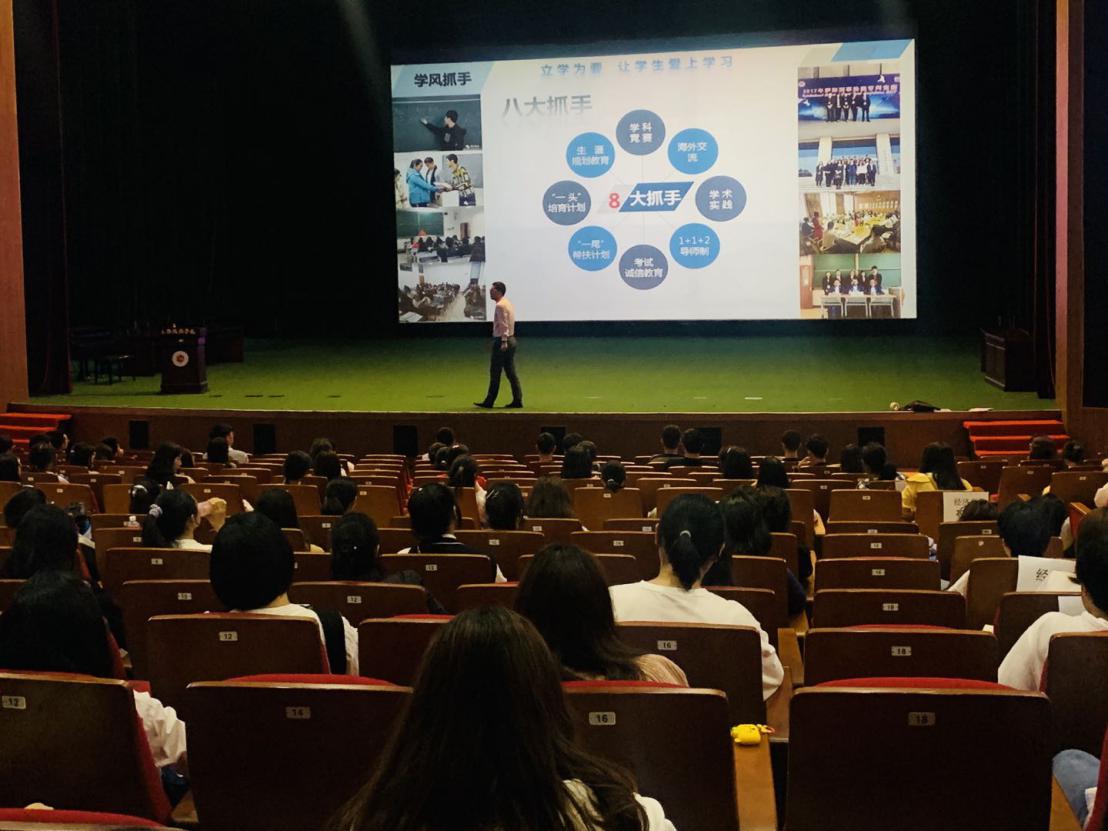 徐海琨从贴近同学们学习生活的当下热点词出发,对学校、学院及经管专业情况进行介绍,以朋辈学长的身份与同学们畅谈理想与选择,向新生们传授经验,表达对未来的期许,拉近了师生间距离,增强了同学们的专业认知与自信。他结合自身求学经历及在上政工作多年的见闻心得,通过幽默生动的案例和台下新生积极互动,帮助学生认清自我、明确目标。现场氛围活跃,讲到精彩之处,现场掌声阵阵。