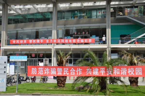 活动现场,保卫处工作人员和派出所民警同志在校园悬挂了“反网络诈骗”宣传横幅标语,并向广大师生发放了常见电信网络诈骗手法宣传册。来自青浦公安分局交警支队、治安支队、青浦夏阳街道平安办等几家单位的相关工作人员现场为学生解读预防网络电信诈骗知识,还通过防范电信诈骗问卷调查的方式进行现场互动宣传防诈骗常识。
