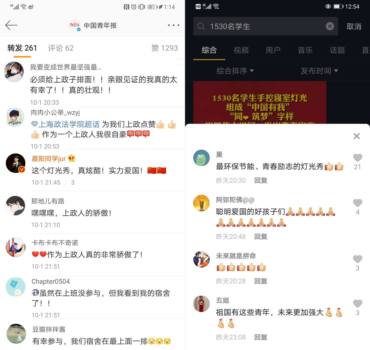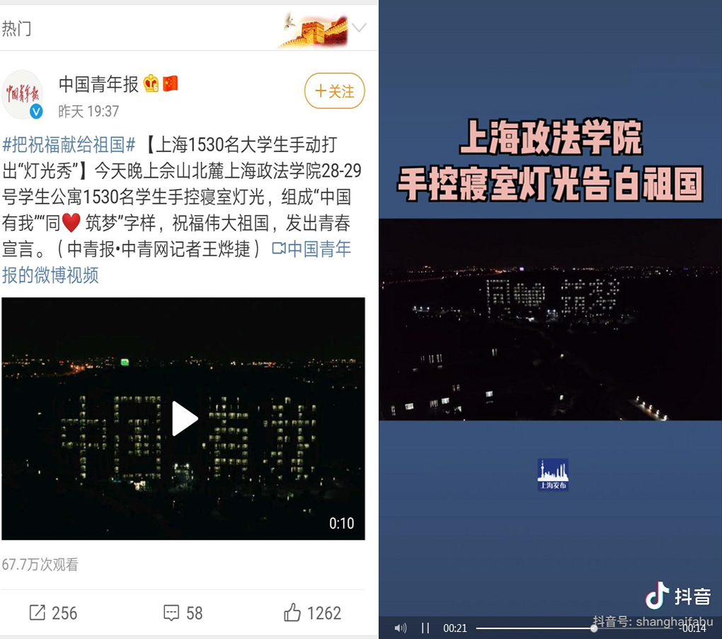 学校的无人机也从高空记录下这一令人激动的亮灯过程。国庆节当晚,由无人机拍摄的视频画面,先后登上“上海发布”抖音号、“中国共青团”抖音号、中国青年报微博,迅速受到广泛关注。截至10月2日中午12时,微博阅读量达到67.7万,抖音播放量超过20万,众多网友留言点赞。