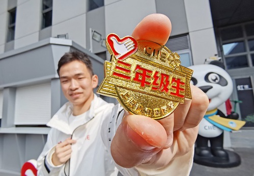 宣誓仪式现场,第一年服务进博会的“小叶子”们戴上了铜色徽章,连续参加两届或三届进博会志愿服务的“二年级生”和“三年级生”则分别收获了银色和金色徽章。他们共有671人,占总人数比14%。