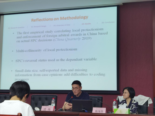 本次讲座主题为“司法地方保护主义的中央化控制机制有效性——以执行涉外仲裁裁决内部报告制度为切入视角”。法律学院陈海萍教授主持讲座。