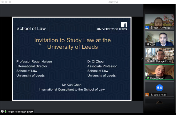 10月26日晚,英国利兹大学法学“3+1”项目宣讲活动在线上平台顺利开展。英国利兹大学法学院国际发展项目主任Roger Halson教授、利兹大学法学院LL.M项目负责人、副教授 Dr. Qi Zhou、中国项目负责人Kun Chen先生、我校国际交流处副处长张正怡参加了本次宣讲会。国际交流处学生项目主管刘灵主持宣讲。