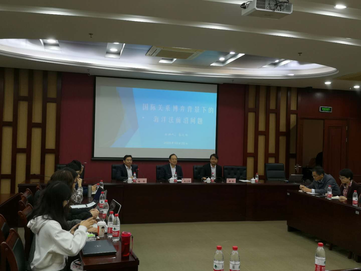 10月27日上午,国际海洋法法庭原法官、中国海洋法学会会长、海南大学法学院特聘院长高之国教授应邀在综合研究中心107为我校师生开设名家讲坛第五十二讲——“国际关系博弈背景下的海洋法前沿问题”。本次讲座由人工智能法学院院长杨华教授主持,上海海洋大学唐议教授与谈。四十余位师生参加了本次讲座。