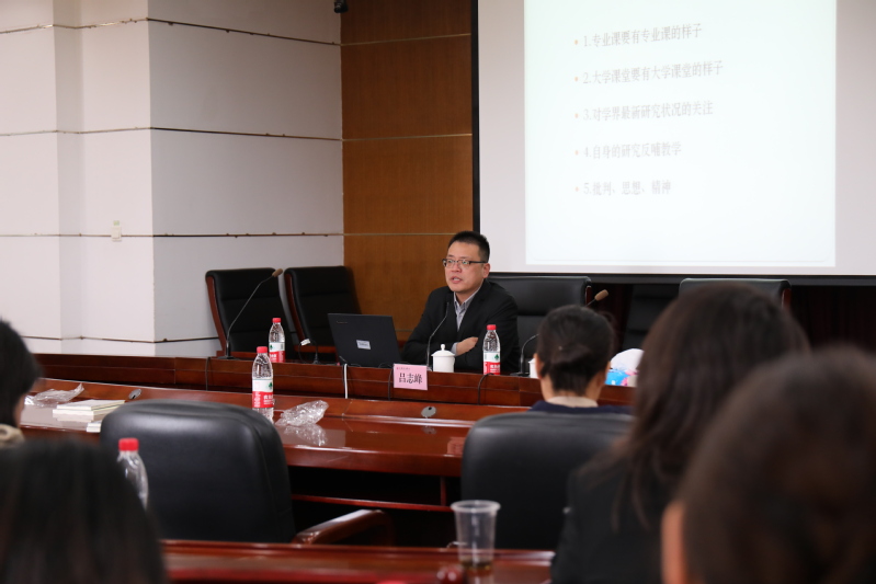 讲座中,吕志峰以参加全国高校青年教师教学竞赛的亲身经历为引,结合自己多年的教学经验,提出教学比赛是内容与形式的深度融合,课堂教学亦然。他从“学术:大学课堂的根本”“课程如何思政”“学生:永远不要低估”“技巧:课堂教学的助推剂”四个方面,讲到要用专业性、学术性、前沿性的课堂去教授学生;要落实立德树人根本任务,引导学生培养自主思考的能力和反思研究的能力;要用充实的课堂内容去让学生汲取知识;要以充分的教学准备和语言教态吸引学生对课堂的关注。