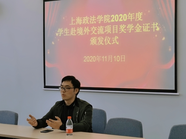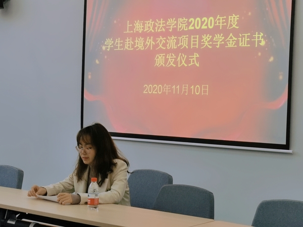 11月10日下午,2020年度学生赴境外交流项目奖学金证书颁发仪式于上合基地103会议室举行。国际交流处学生项目主管刘灵主持本次活动。