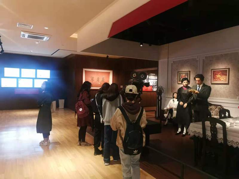 国歌展示馆总面积1500平方米,由序厅、国歌诞生厅、国歌纪念厅、国歌震撼厅、我和国歌厅等6个部分组成。一进入国歌展示馆,映入眼帘的便是一组群雕,象征着影片《风云儿女》主人公辛白华、阿凤及其祖父奔赴前线的事迹。继续向里走,可以看到一张为《义勇军进行曲》灌制的胶片。来到二层,一行行镂空的字体,将国歌用各个国家的语言,刻在了墙上,在这里大家还有幸听到了不同时期不同版本的《义勇军进行曲》,第一次以如此亲近又如此震撼的方式了解到国歌背后的故事。当《义勇军进行曲》一次次响起的时候,特别在听到第一版的《义勇军进行曲》时,学生党员们的内心无比的激动,仿佛亲身经历了这可歌可泣的伟大历程,灵魂深处受到一次次的震撼。一面“我和国歌”多媒体展示墙上每个屏幕里都有一个人娓娓动听地讲述“我和国歌”的故事。