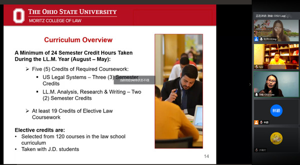 11月16日晚,俄亥俄州立大学法学项目宣讲活动在线上平台顺利开展。俄亥俄州立大学法学院中国区项目负责人孙依,俄亥俄州立大学法学院校友施展参与了本次宣讲会,我校国际交流处学生项目主管刘灵主持了本次宣讲。