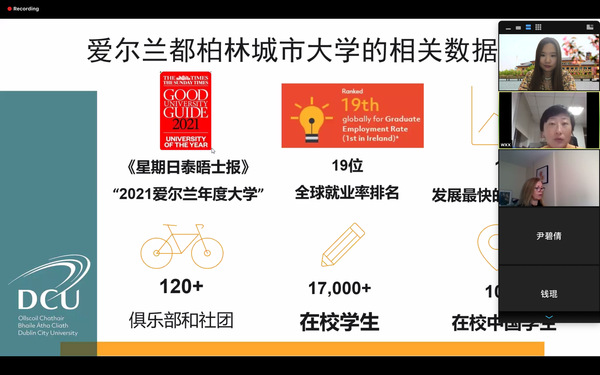 11月19日晚,爱尔兰都柏林城市大学项目宣讲活动在线上平台顺利开展。都柏林城市大学国际处高级国际事务老师Ms.Caroline Magee、中国区策略合作项目经理Mrs. Xiaoxia Wang参与了宣讲,我校国际交流处学生项目主管刘灵主持本次活动。
