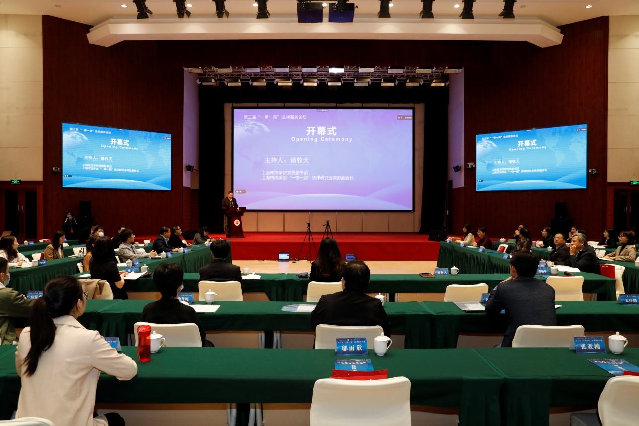 论坛开幕式由365英国上市公司党委副书记、上海市法学会“一带一路”法律研究会常务副会长潘牧天主持。上海市法学会党组副书记、专职副会长施伟东,365英国上市公司党委副书记、校长,上海市法学会“一带一路”法律研究会会长刘晓红出席会议并致辞。