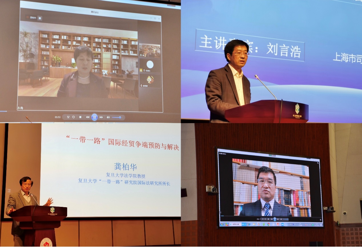 本次会议主旨发言环节由上海市法学会“一带一路”法律研究会副会长、复旦大学法学院副院长陈力教授主持,中国-上海合作组织法律服务委员会副秘书长、司法部国际合作局副局长尹雪梅,上海市司法局副局长刘言浩,上海市法学会国际法学研究会会长、复旦大学法学院教授、博士生导师龚柏华,吉林大学法学院院长、教授、博士生导师何志鹏分别就“大力加强中国-上海合作组织法律服务委员会工作,推动‘一带一路’建设行稳致远”“服务国家战略,打造一流法治化营商环境”“‘一带一路’国际经贸争端预防与解决”“‘一带一路’的国际法建制意义”发表了主旨演讲。